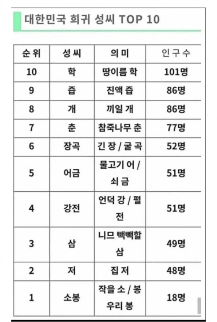 대한민국 희귀 성씨 top 10