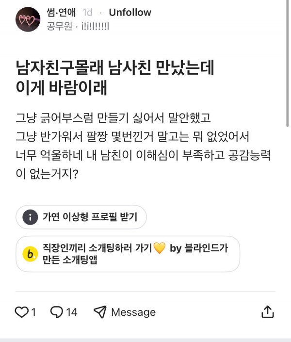 남자친구 몰래 남사친 만났는데 이게 바람이래 짜라빠빠 2 197 0 0 09.30 17:55 ㅋㅋㅋㅋㅋㅋㅋ 0 0 Author 0 0 Lv.23 짜라빠빠 아이언 195,640 (72.8%) 등록된 서명이 없습니다.
