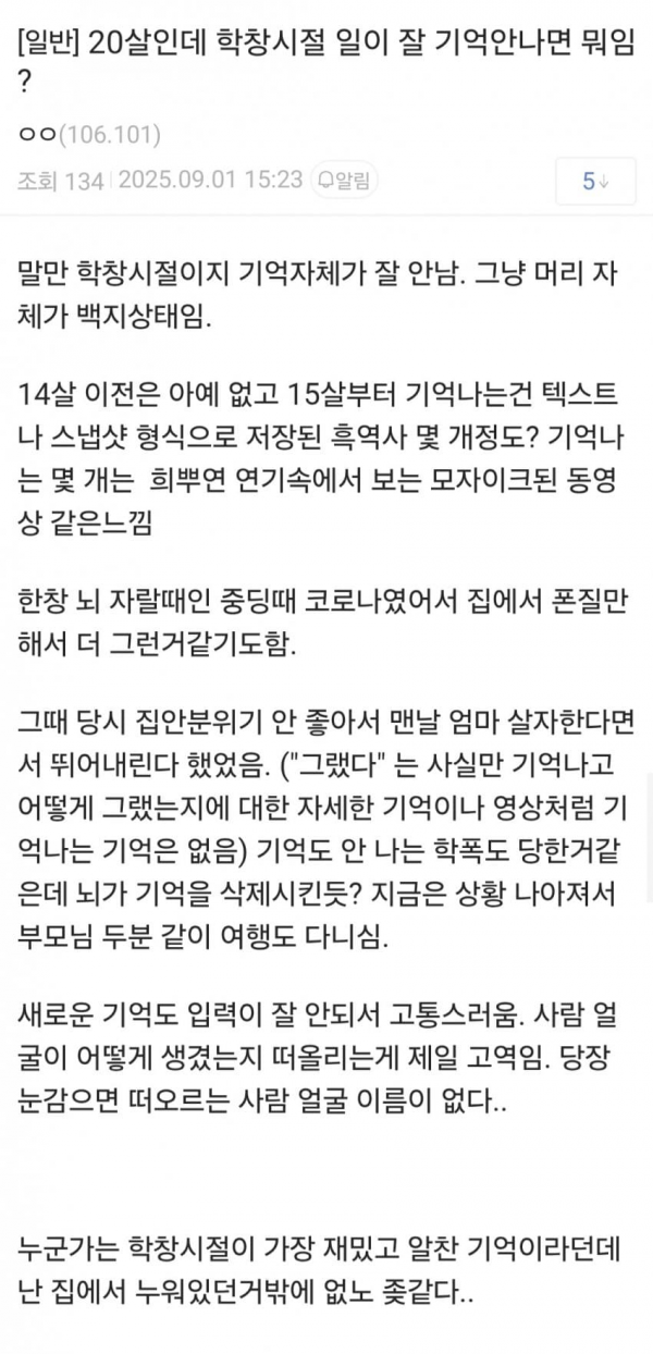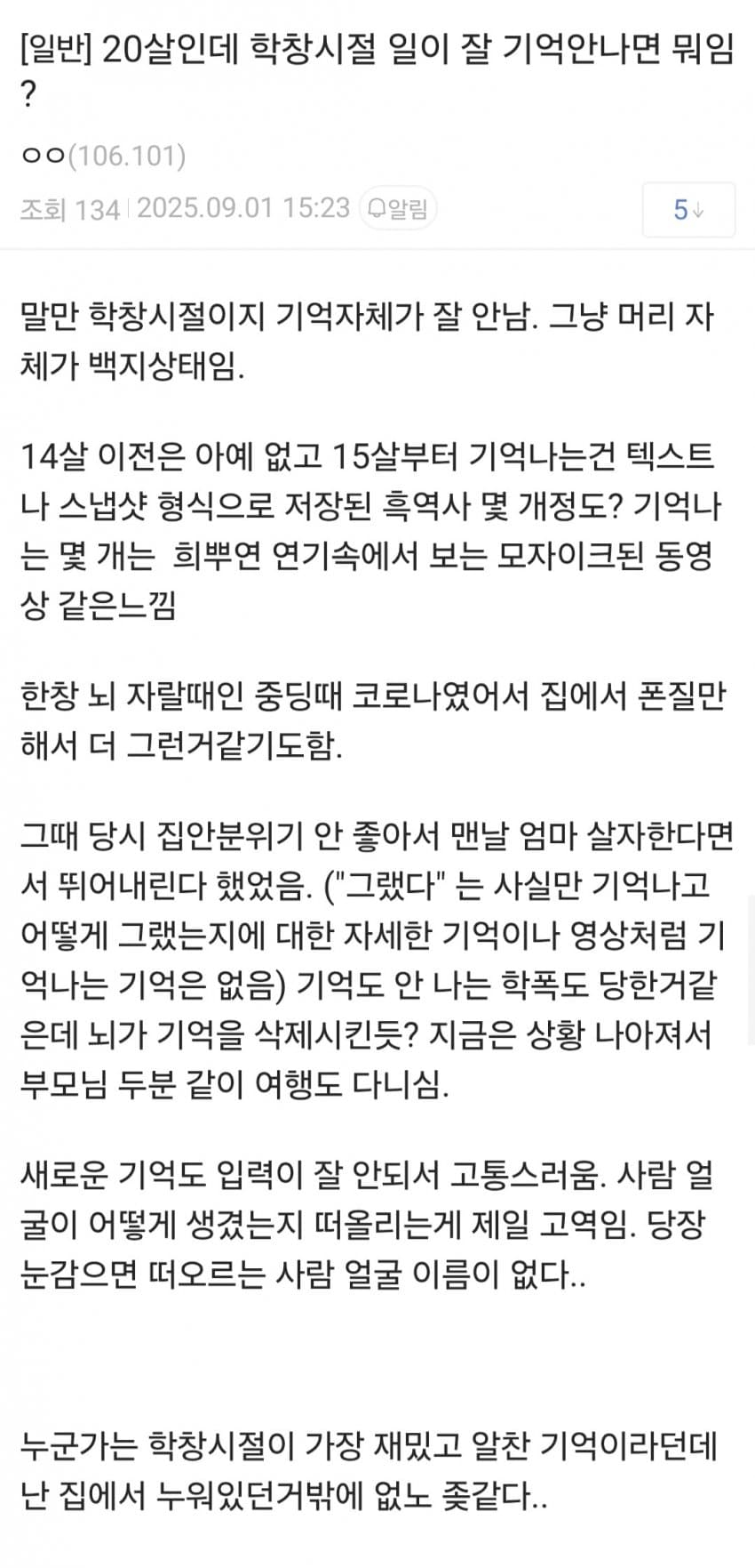 학폭으로 인해 20살 이전 기억이 없는 사람..jpg 타짜이진호 0 15 0 0 09.30 12:53 ㅜㅜ 0 0 Author 0 0 Lv.27 타짜이진호 아이언 270,650 (89.3%) 등록된 서명이 없습니다.