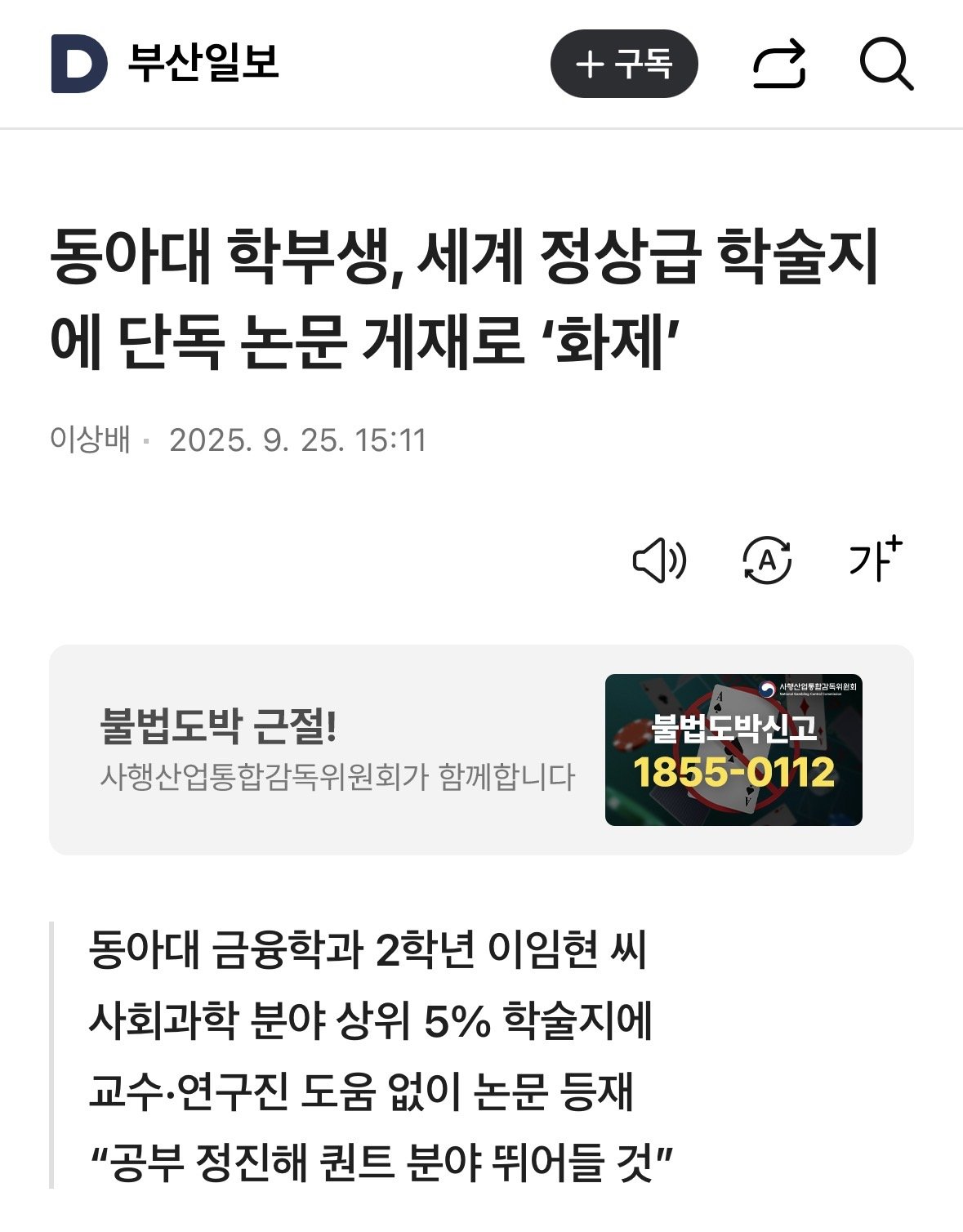 동아대 학부생 "단독저자"로 SSCI급 저널 게재 ㄷㄷ 다섯가지자 1 160 1 0 09.28 16:52 동아대 학부생, 세계 정상급 학술지에 단독 논문 게재로 ‘화제’학부생때 Q1저널을 쓰는건아예 경우가 없는 건 아니다만 (물론 스카이 급에서도 드뭄)교수 도움도 없이"혼자 논문들 읽고""혼자 논문을 써서"단독저자로 Q1 저널에 억셉된건 진짜 말도 안 됨ㄷㄷㄷ 1 0 Author 0 0 Lv.30 다섯가지자 아이언 323,560 (48.6%) 등록된 서명이 없습니다.
