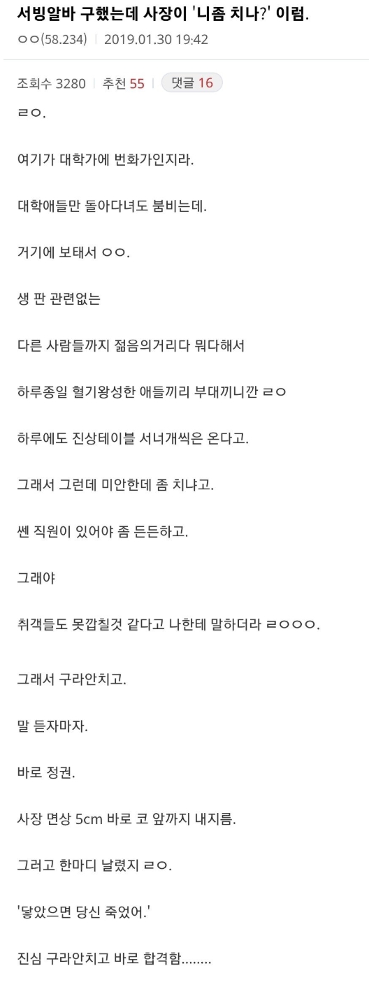 사장한테 쎈척하고 알바 합격한 디시인.jpg 붕붕이 1 165 1 0 09.27 15:15 ㅋㅋㅋㅋㅋㅋ 1 0 Author 0 0 Lv.16 붕붕이 아이언 98,580 (87.6%) 등록된 서명이 없습니다.