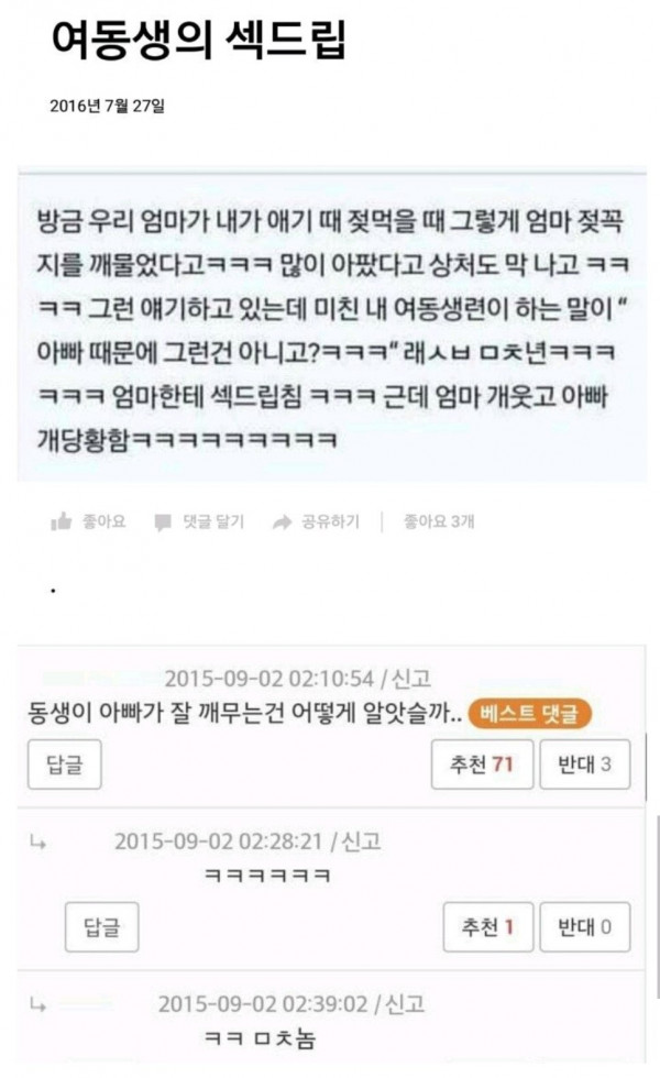 아버지 당황하게 만든 여동생 .jpg 타짜이진호 5 227 0 0 09.25 17:18 ㅋㅋㅋㅋㅋㅋ 0 0 Author 0 0 Lv.27 타짜이진호 아이언 270,150 (86.7%) 등록된 서명이 없습니다.