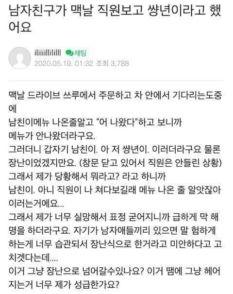 남자친구가 맥날 직원보고 쌍년이라 함 짜라빠빠 1 27 0 0 10.07 21:02 가오충 아웃 0 0 Author 0 0 Lv.24 짜라빠빠 아이언 201,790 (9.8%) 등록된 서명이 없습니다.