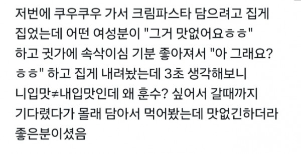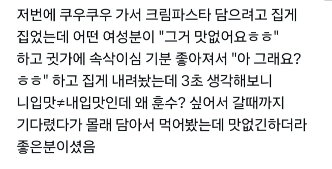쿠우쿠우 가서 크림파스타 담으려고 집게 집었는데ㅋ 휘낭시에 2 21 0 0 10.10 09:13 ㅋㅋㅋㅋㅋㅋㅋㅋㅋㅋㅋ 0 0 Author 0 0 Lv.12 휘낭시에 아이언 54,880 (61.8%) 등록된 서명이 없습니다.