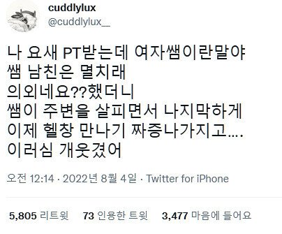 헬스장 PT 여쌤의 남친은 의외로 멸치.jpg 타짜이진호 0 4 0 0 10.12 15:09 ㅋㅋㅋㅋㅋㅋㅋㅋㅋㅋ 0 0 Author 0 0 Lv.28 타짜이진호 아이언 278,000 (26.6%) 등록된 서명이 없습니다.