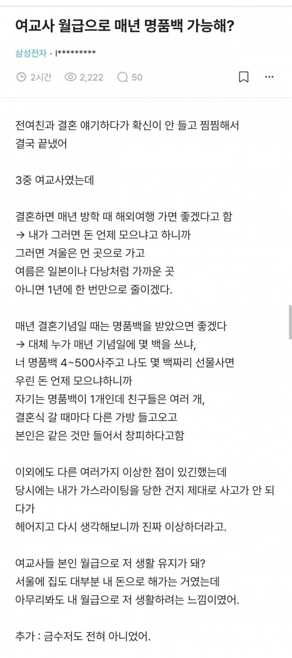 1년마다 명품백 요구하는 여교사랑 결혼 파토 검색 1 103 1 0 10.13 13:57 1 0 Author 0 0 Lv.28 검색 아이언 273,670 (4.8%) 등록된 서명이 없습니다.