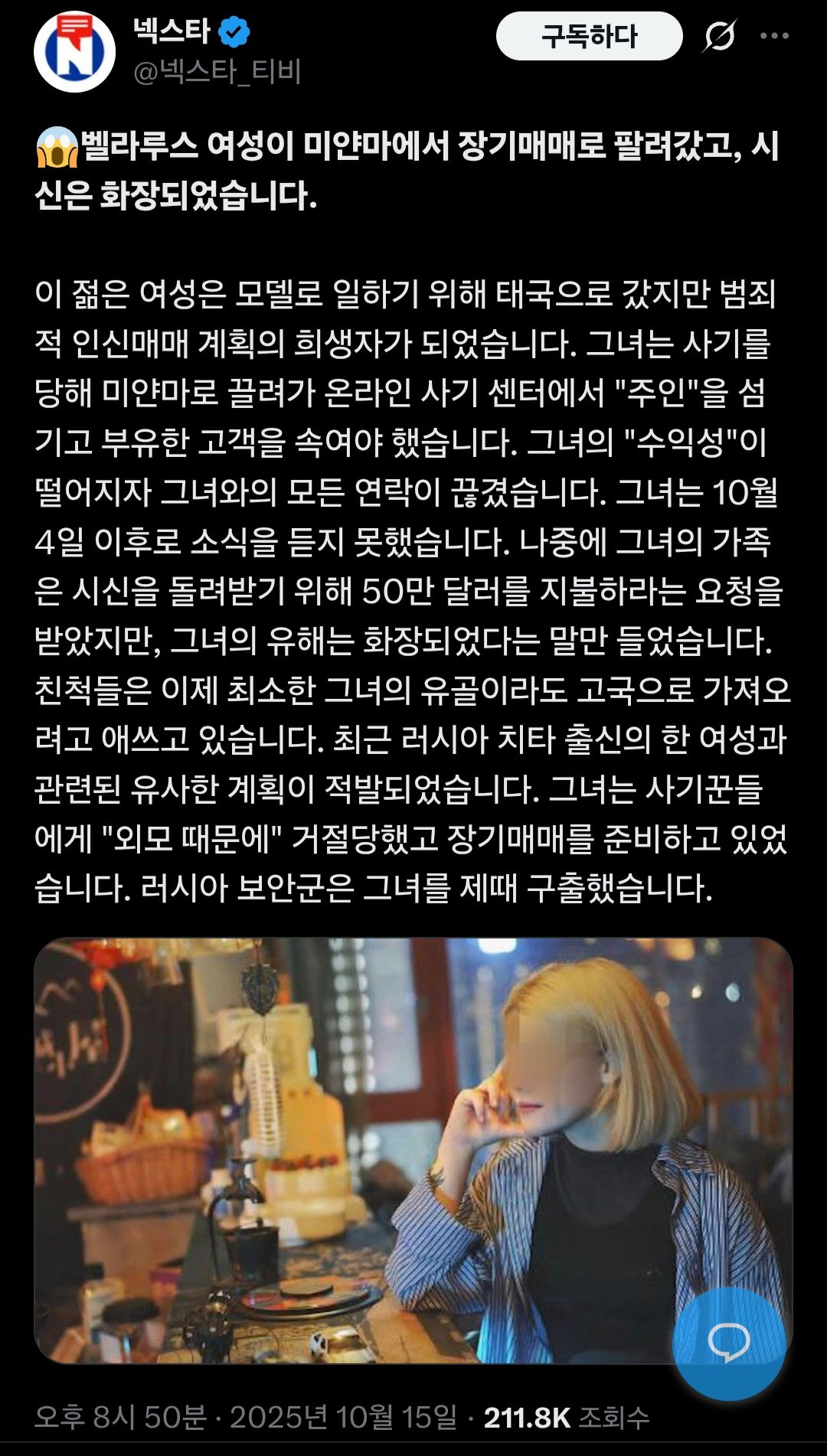 캄보디아만 위험한게 아니다 태국도 납치 사건 발생 달천이 3 180 10.17 11:29 중국 갱단이 미얀마에서도 활동 하는 중. 그냥 앞으로 동남아 취업 관련 여행은 자제 해야 하는 게 맞는 거 같다태국에서 조차 납치 당해서 미얀마로 끌려갔다가 이후 사기에 강제 가담 > 사기 실적이 줄어들자 장기 적출 후 살해 ㄷㄷ