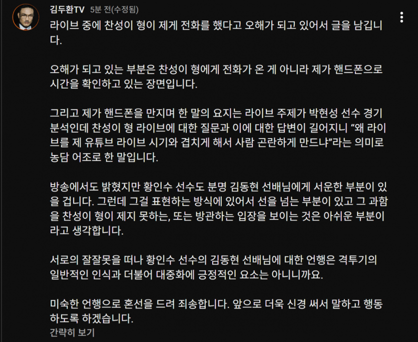포텐에 김두환이 비판해서 정찬성이 전화했다는 글에 대한 팩트체크