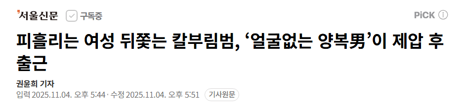 피흘리는 여성 뒤쫓는 칼부림범, ‘얼굴없는 양복男’이 제압 후 출근