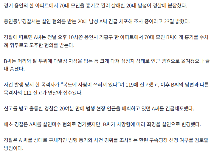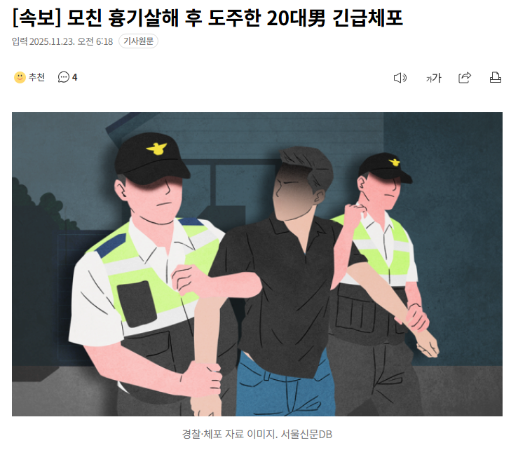 [속보] 모친 흉기살해 후 도주한 20대男 긴급체포