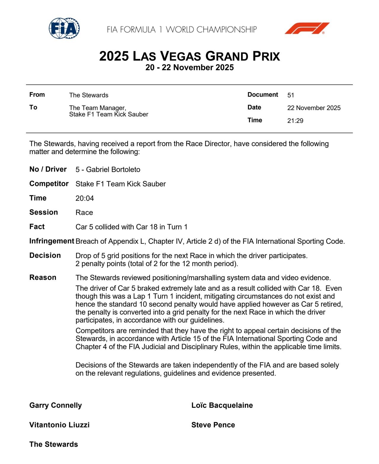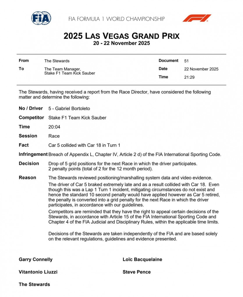 [오피셜] 보톨레토, 다음 레이스에서 5그리드 강등 및 벌점 2점