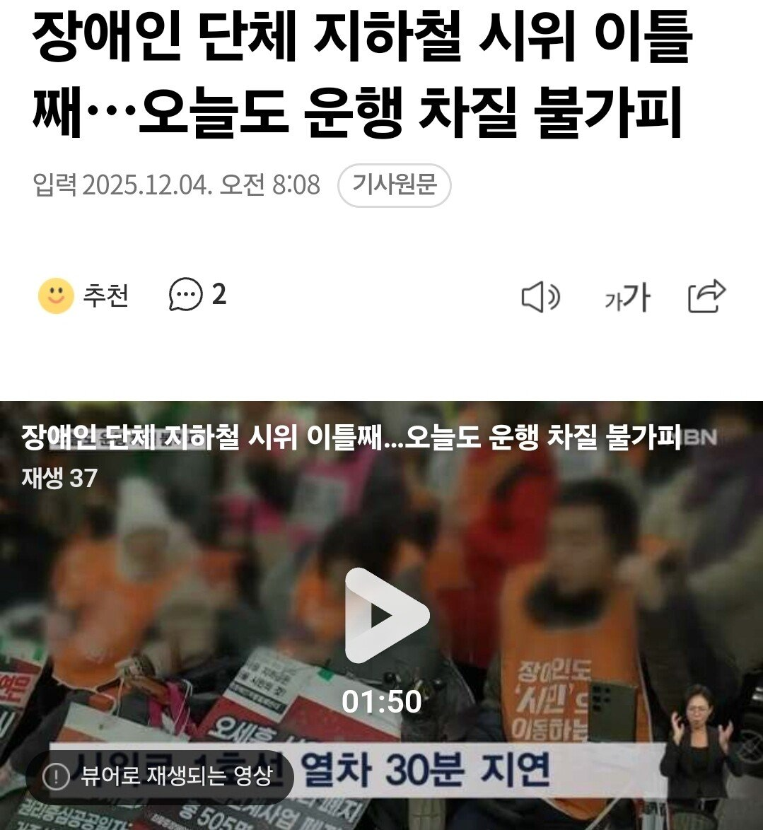 출처 : 장애인 단체 지하철 시위 이틀째…오늘도 운행 차질 불가피