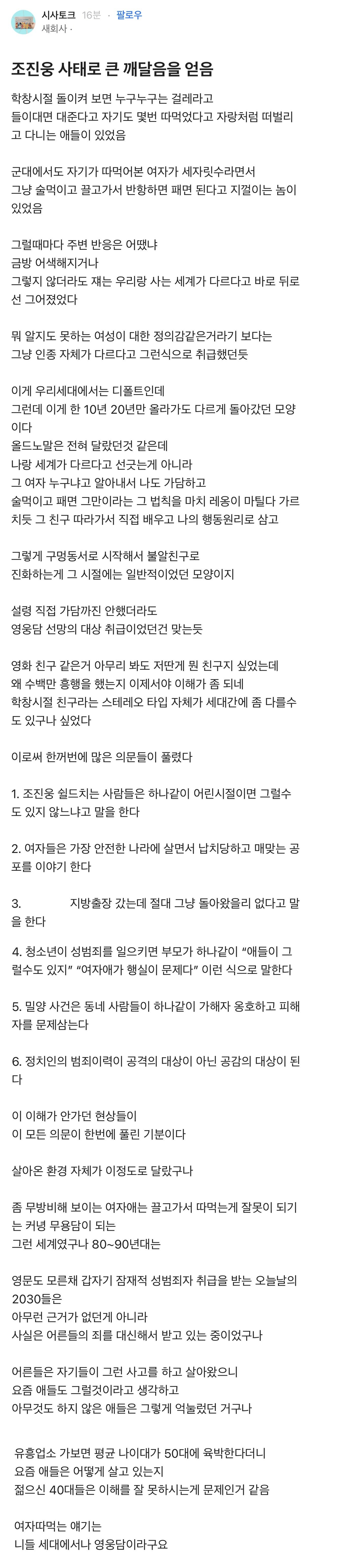 사회규범이 정형화되고 사회가 안정된 시대에 살아온 90년대생부터는 공감못함