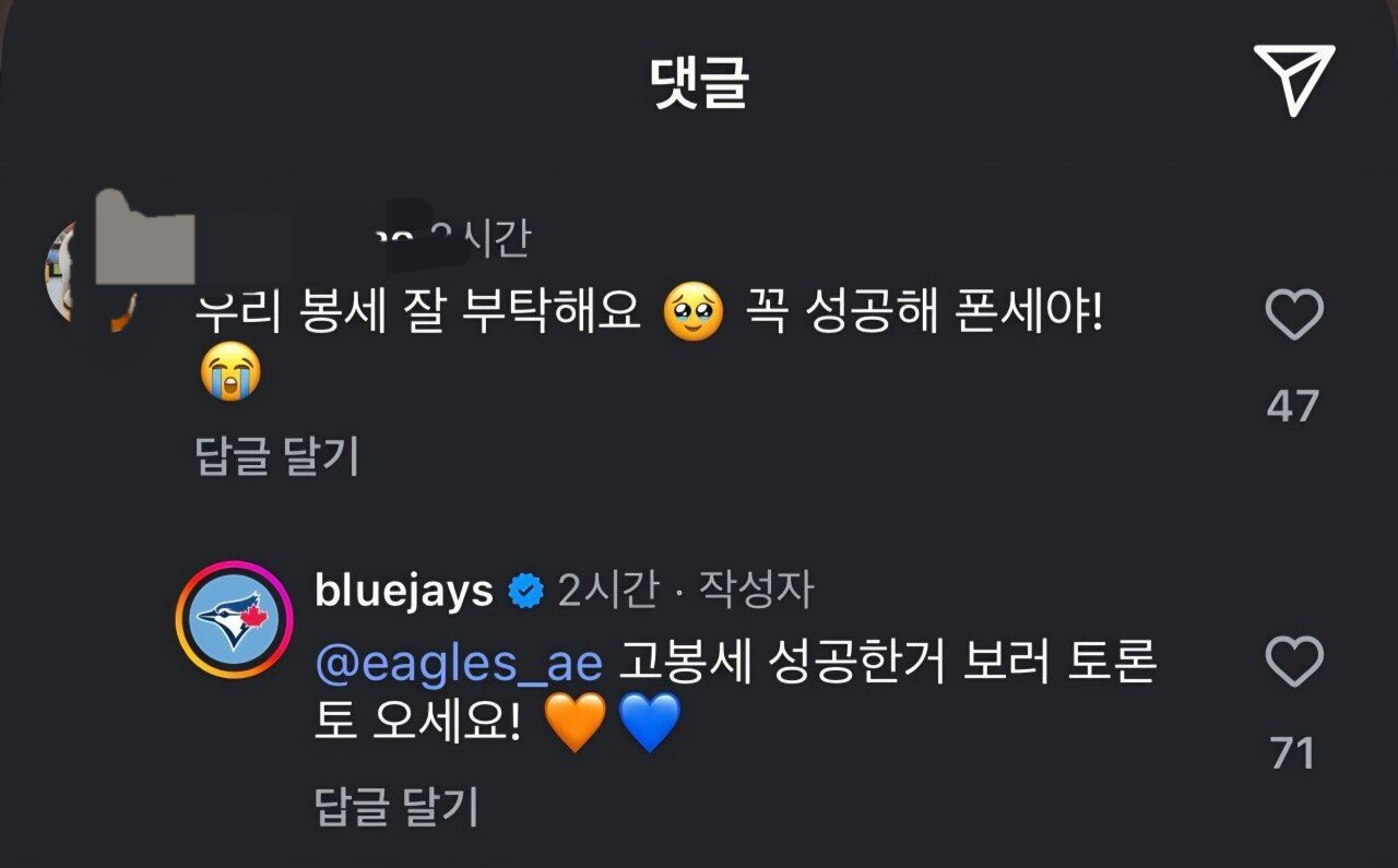 블루제이스 인스타 한화팬 답변 ㄷㄷ