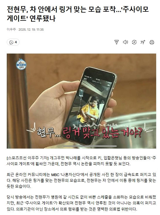 전현무, 차 안에서 링거 맞는 모습 포착…'주사이모 게이트' 연루됐나