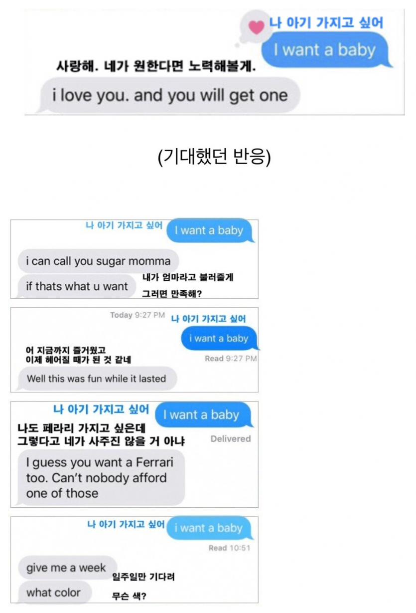 남친에게 "나 아기 갖고 싶어"라고 보내봤다.