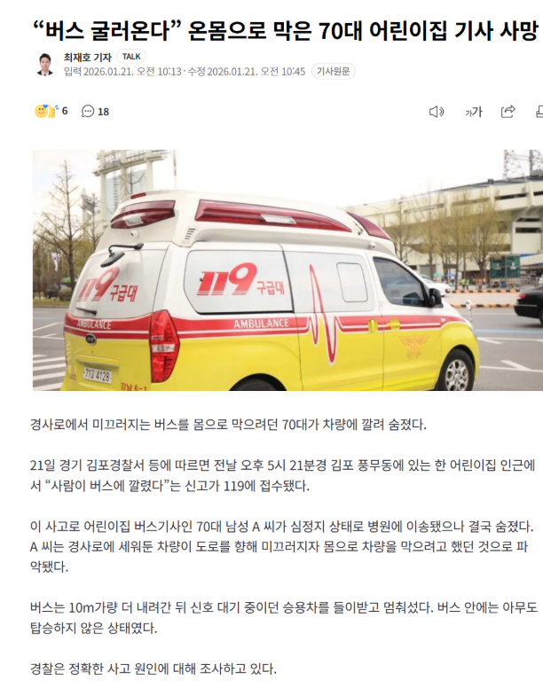 “버스 굴러온다” 온몸으로 막은 70대 어린이집 기사 사망