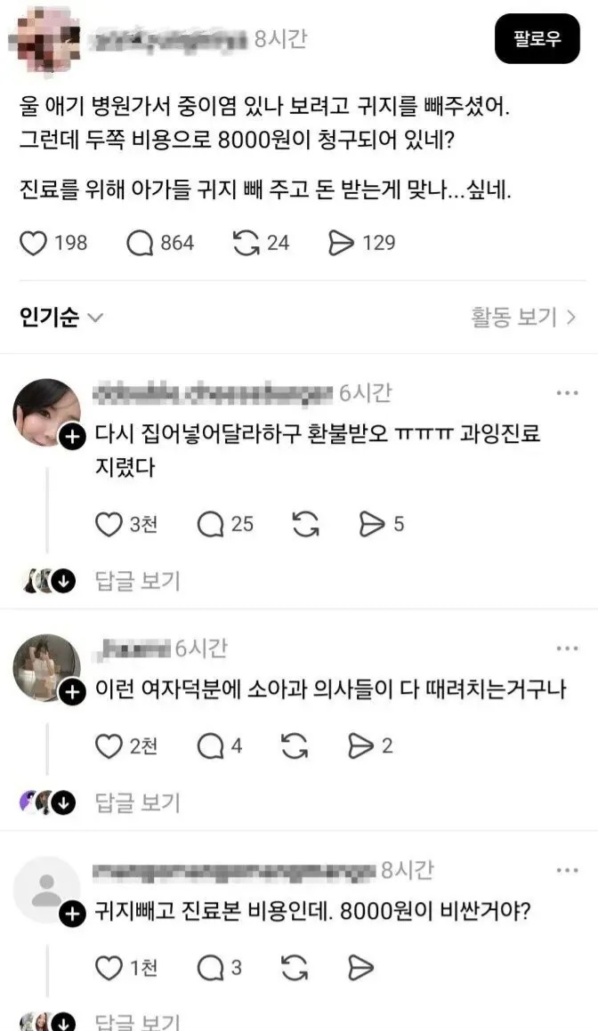 귀지 빼주고 과잉 청구했다는 소아과