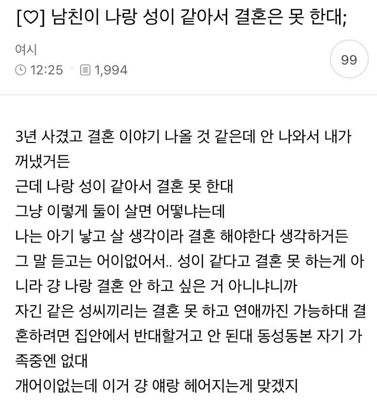 남친이 나랑 성이 같아서 결혼은 못 한대;;.jpg