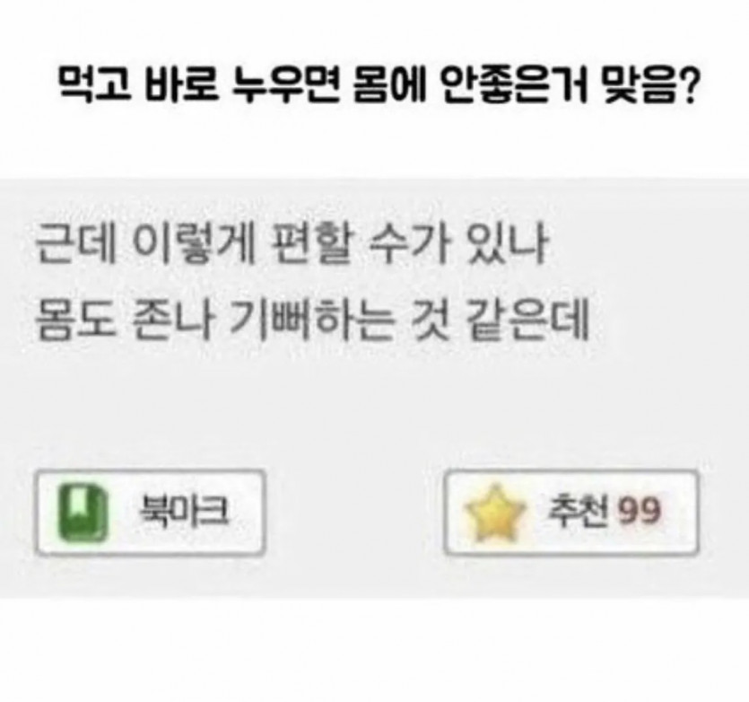 먹고 바로 누우면 몸에 안좋은거 맞음?