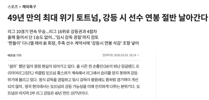 토트넘 "강등시 50% 연봉삭감"