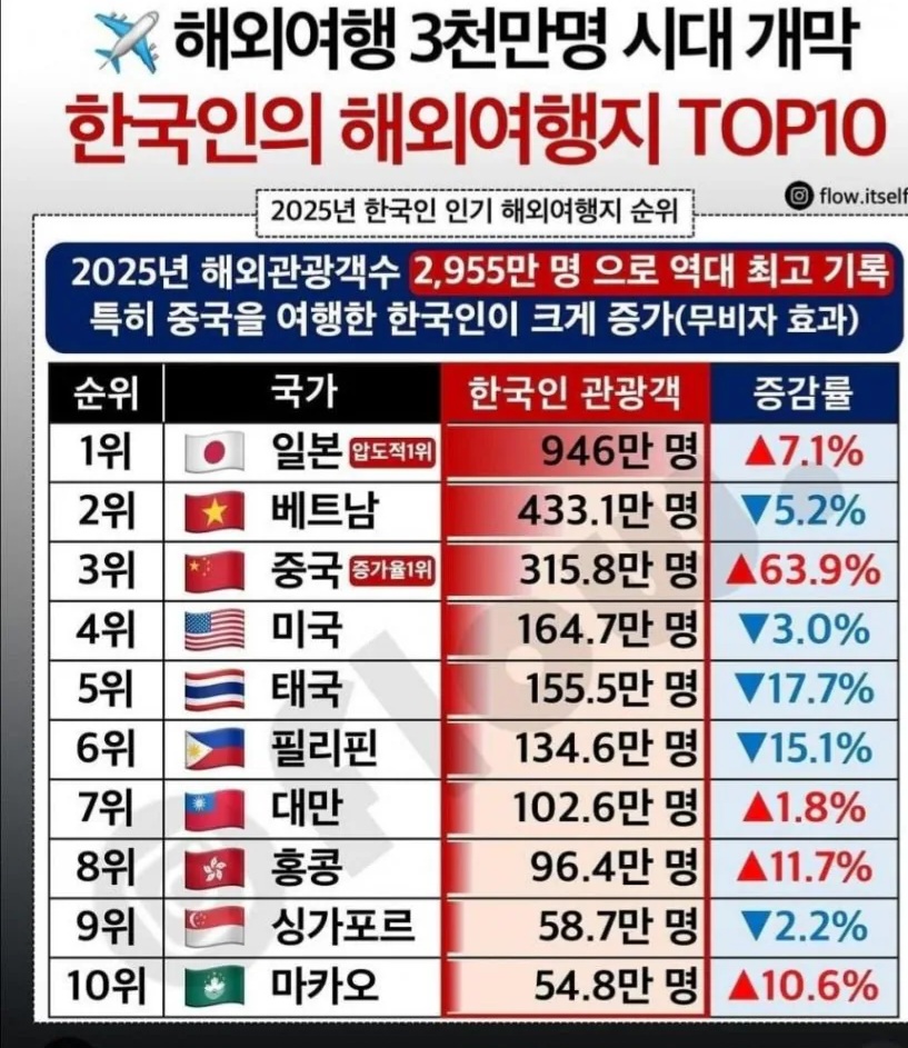 한국인 해외 여행지 탑10