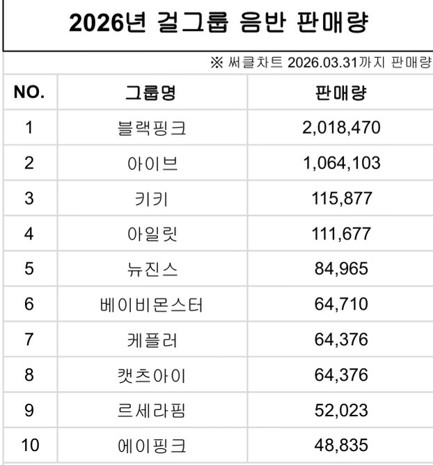 2026년 걸그룹 앨범 판매 순위