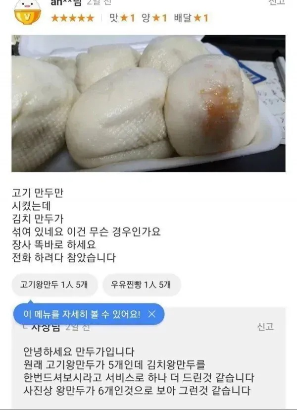 고기만두 5개 시켰는데 김치만두 섞여있음