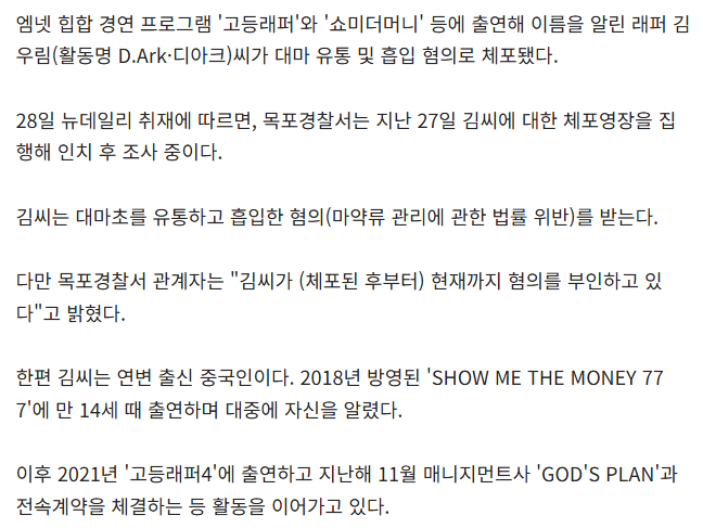 [단독] '고등래퍼' 출연 중국인 래퍼 디아크(D.Ark), 대마 투약 혐의로 체포