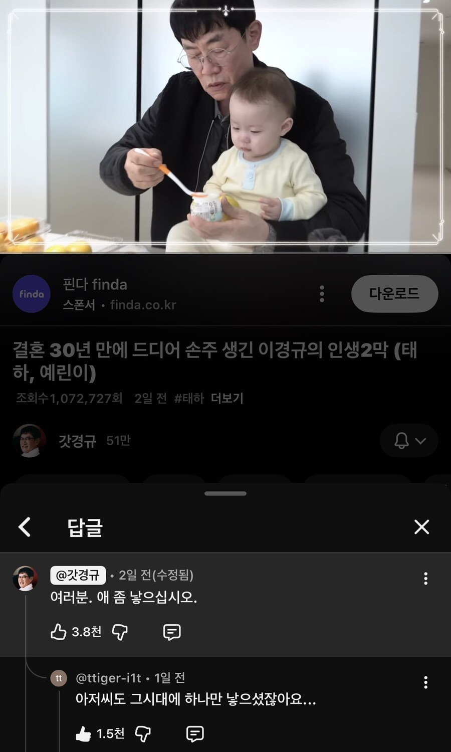 최근 손주 봐서 꼰대 댓글 좀 단 경규옹.