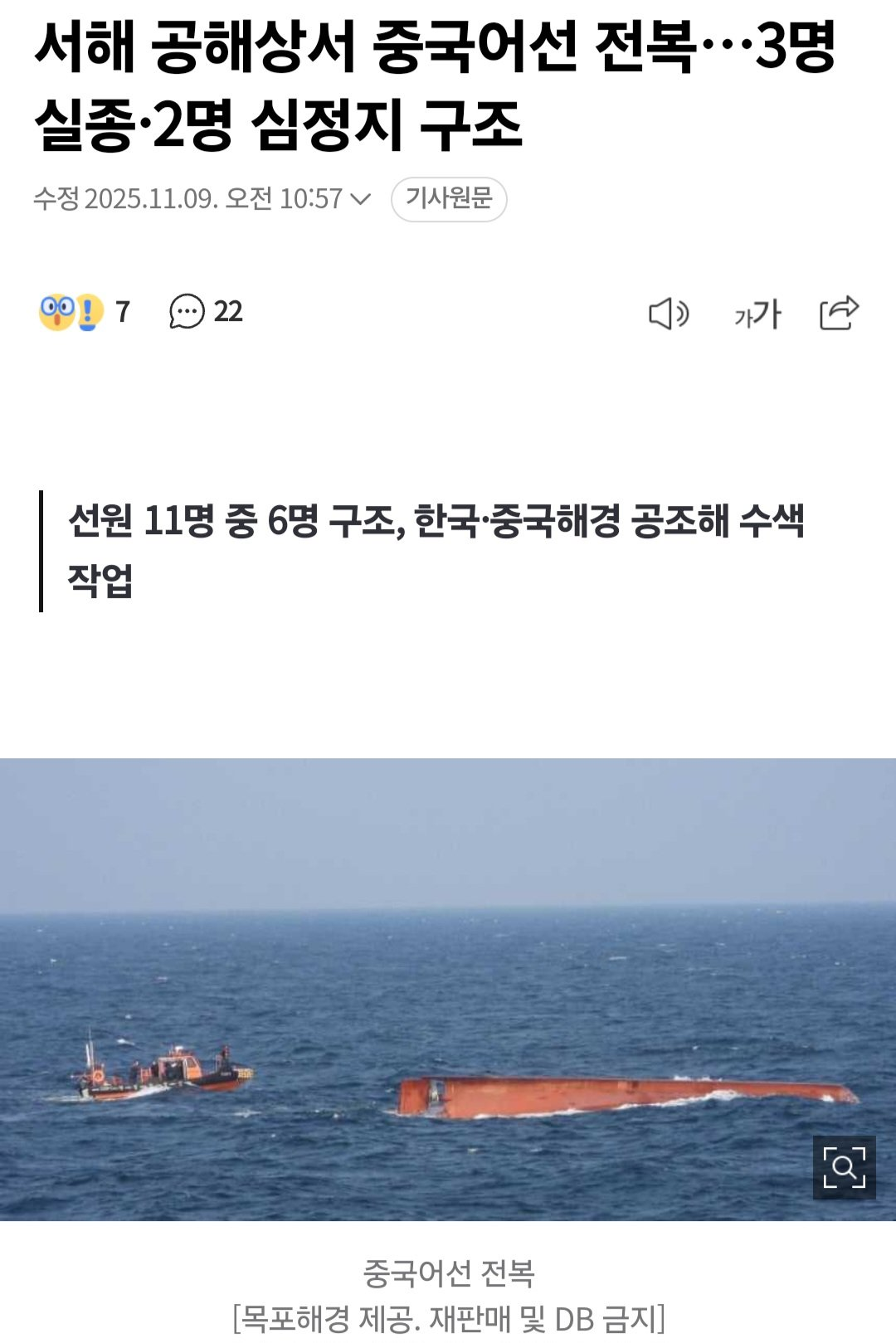 서해 공해상서 중국어선 전복…3명 실종·2명 심정지 구조