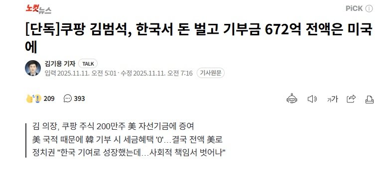 쿠팡 김범석, 한국서 돈 벌고 기부금 672억 전액은 미국에