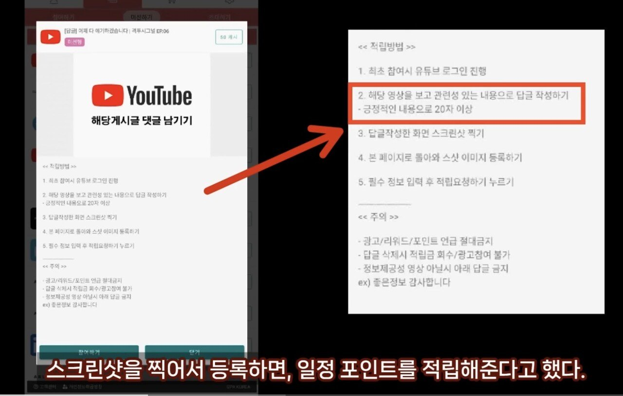 - 정찬성이 올린 영상 시청과 영상내에 20자로 관련 긍정적인 좋은 댓글쓰면 포인트(캐쉬)를 지급하는 앱테크 어플광고가 발견됨