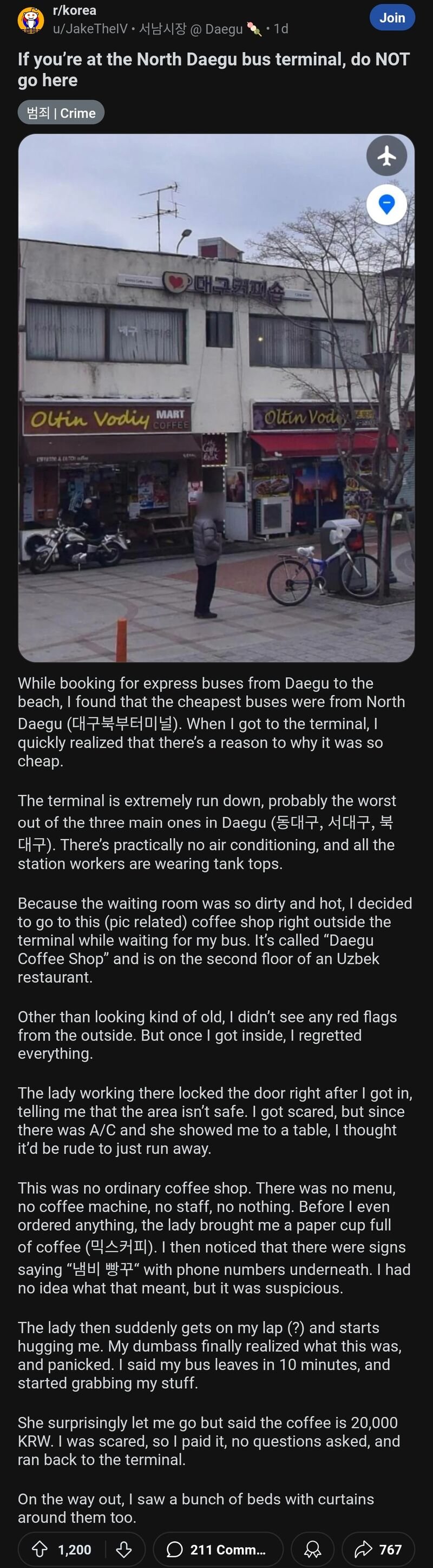 뜻밖의 한국문화를 체험한 외국인 올인원 1 45 11.20 07:23 터미널 근처 낡은 카페에 들어서니 메뉴도 없고 레이디 하나가 믹스 커피 한 잔 타오더니 냉큼 무릎위에 올라탐. 그제서야 어떤곳인지 깨닫고 나옴. 커피값은 2만원 ㅋㅋㅋ
