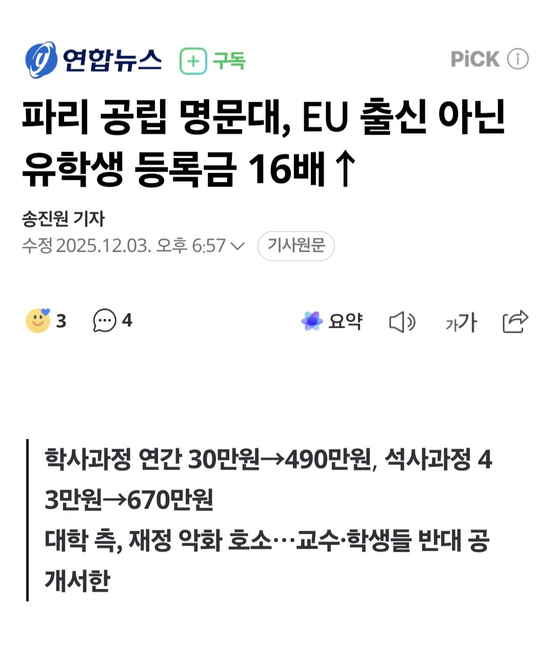프랑스 :EU 출신 아닌 외국인 유학생 등록금 16배 인상