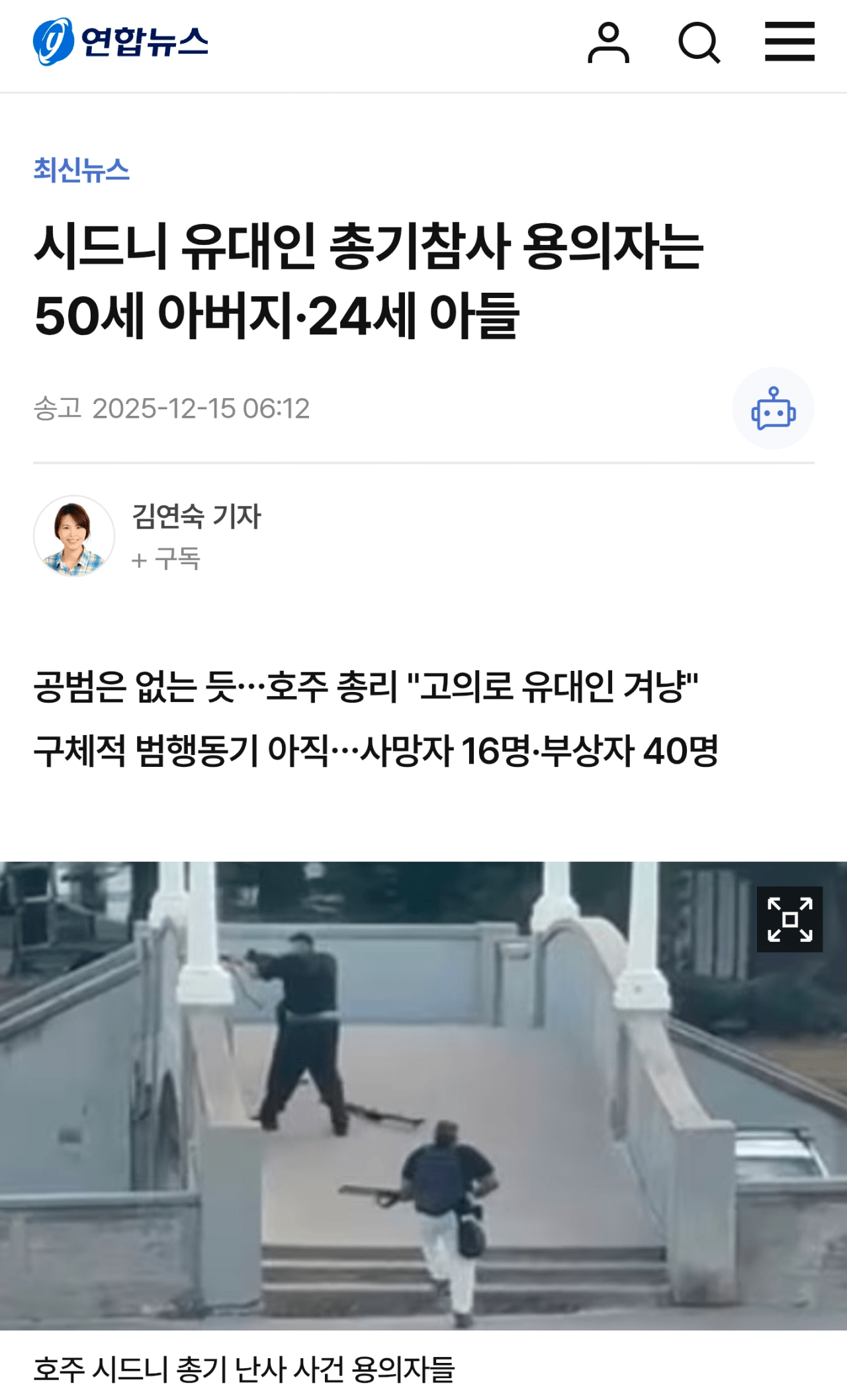 시드니 유대인 총기참사 용의자는 50세 아버지·24세 아들