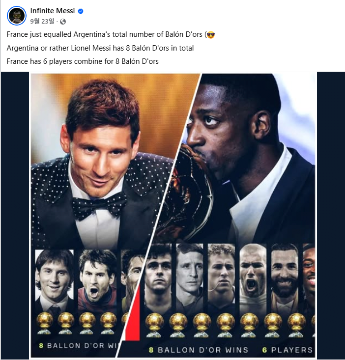 메시 발롱도르 횟수 체감 ㄷㄷ 휘낭시에 1 63 2025.12.26 08:35 메시 = 프랑스 프랑스는 8회로 국가로 따져도 역대 최다 수상 (프랑스 뒤로 독일, 네덜란드, 포르투갈 모두 7회)