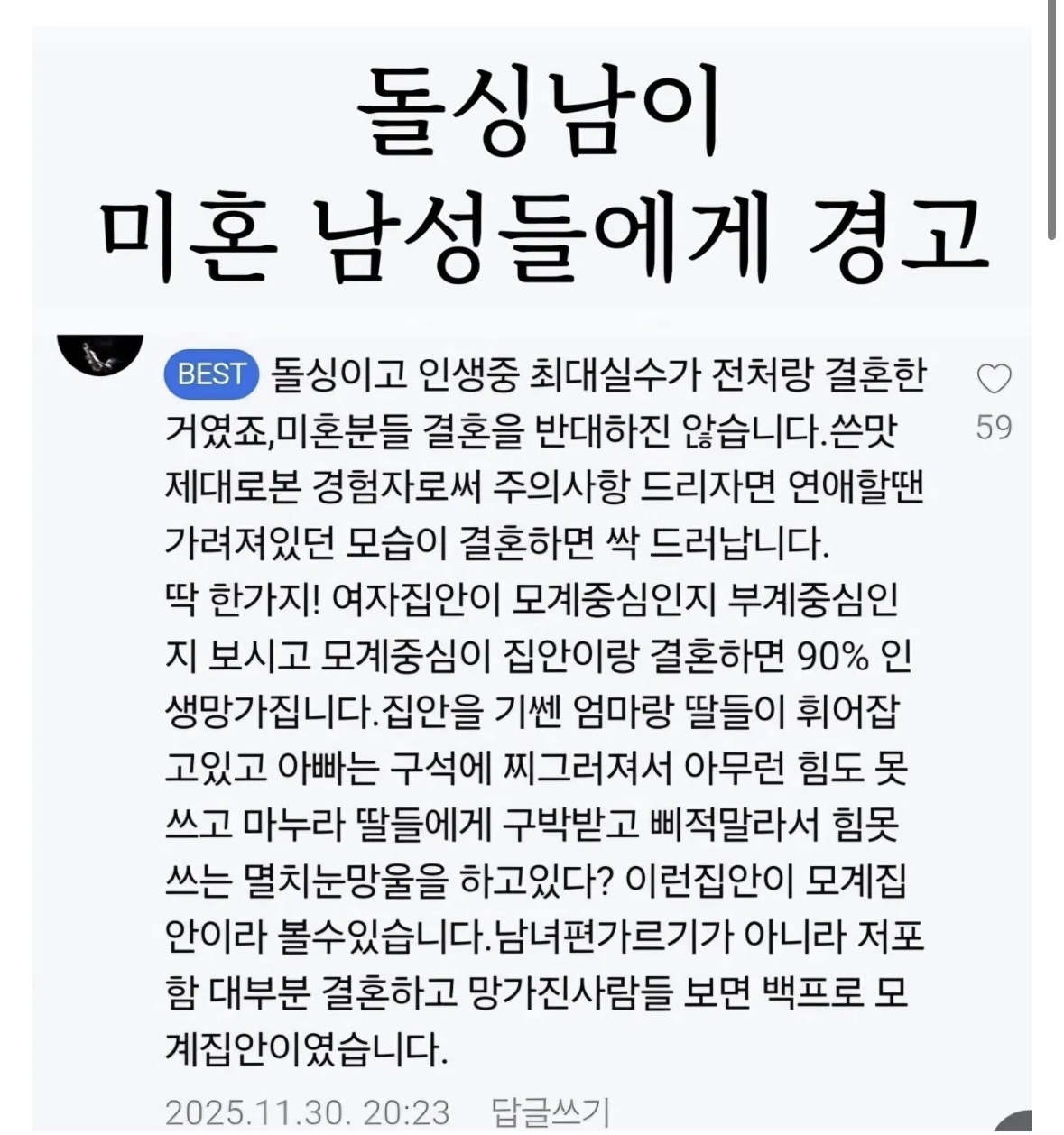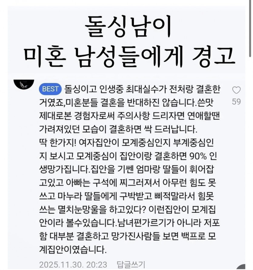 모계중심 집안하고는 결혼하지 말라고 경고하는 돌싱남