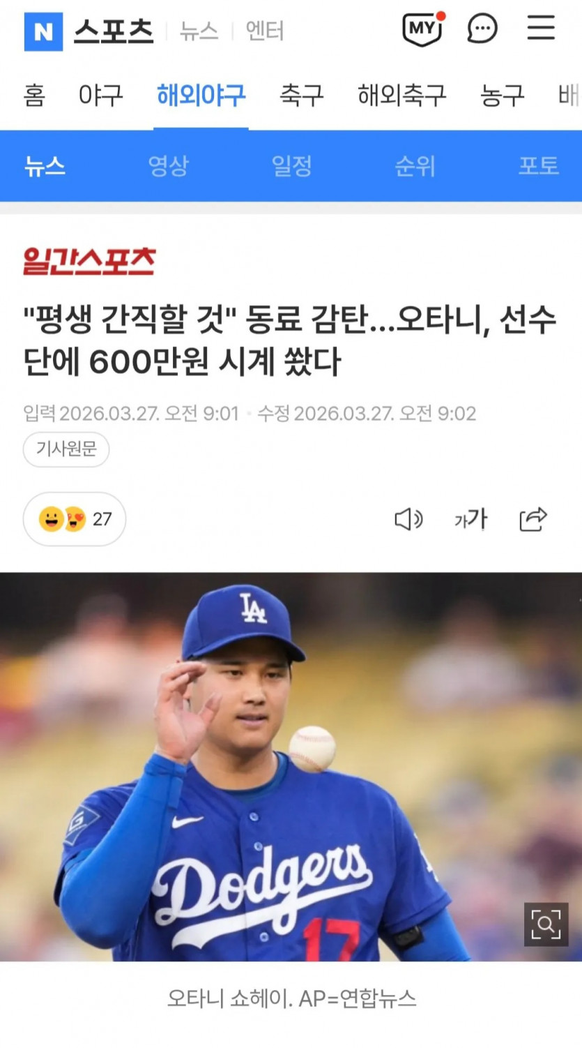 오타니가 선수단에 준 600만원 시계